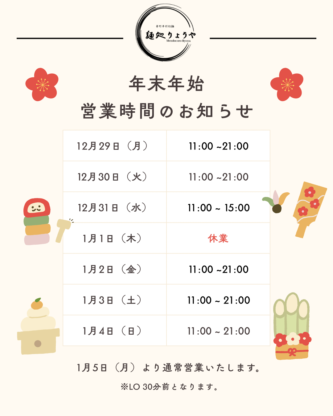 年末年始営業時間について 投稿日 2025年12月21日 著者 Ryoya カテゴリー 未分類 年末年始の 営業時間のお知らせです。 年内は 📅 12/31(水)まで営業 ※31日は 15:00まで となります。 元日はお休みをいただき、 📅 1/2(金)より通常営業いたします🍜 年末年始も、 変わらず一杯一杯丁寧にお作りします。 お近くにお越しの際は、ぜひお立ち寄りください☺️ ※ラストオーダーは各日 30分前 となります。 この記事を書いた人 Ryoya 記事一覧